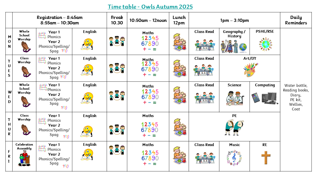 Year 1 and Year 2 are known as Class Owls and are taught by Miss Laing & supported by Mrs Trumble